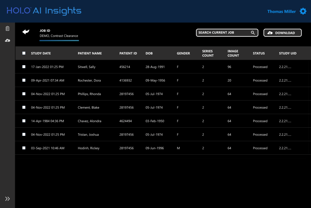 The UI for the web-based HOLO Portal simplifies the user experience into two main concepts: Jobs and Upload. Customers can explore insights from medical imaging studies, facilitates file uploads, automatic parsing, grouping of imaging studies, and tracking algorithm versions.